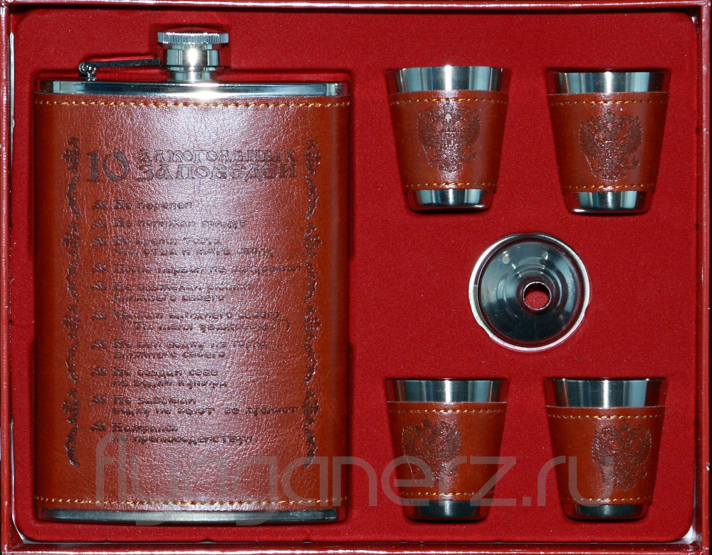Подарочный набор в красивой коробке. Состоит из фляжки 270 мл. с 10-ю алкогольными заповедями, четырёх стопок по 30 мл. и воронки.